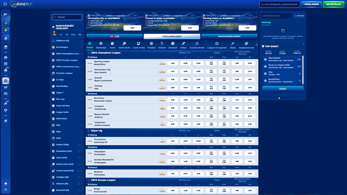 Sportovní kniha Sportovní kniha Označuje kasina, která zahrnují integrovanou sekci sportovního sázení s aktuálními kurzy a trhy napříč sportovními a esportovými událostmi.