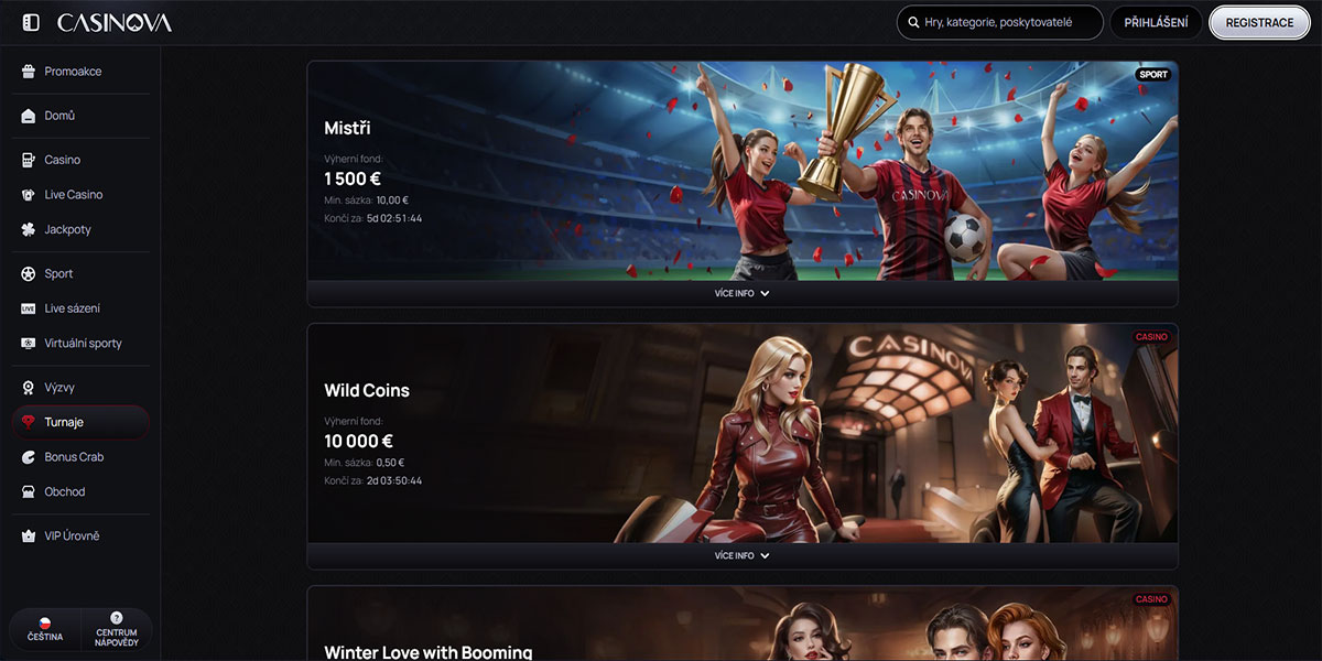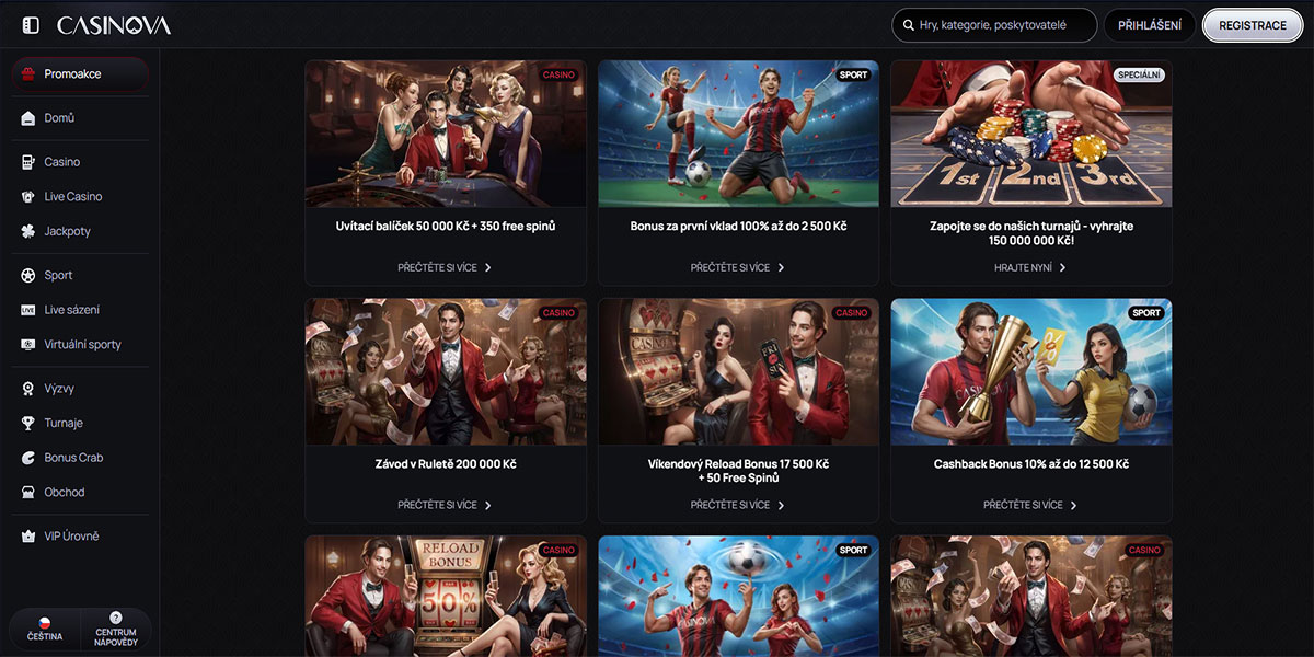 Casinova Casino vstoupilo na scénu v roce 2024 s licencí Anjouan (8048/JAZ) a odvážným slibem: velký výběr, žádné starosti. Je postaveno pro české hráče, vyhýbá se změti aplikací – vše běží plynule v prohlížeči, a to i na mobilu. Ponořte se do více než 5 000 automatů, živých stolů a vybraných sportovních sázek, financujte své hraní eury nebo kryptem od pouhých 10 € a užívejte si rychlé výplaty bez bolesti hlavy z drobného písma. Casinova není jen další kasino – je to vaše herní zkratka.