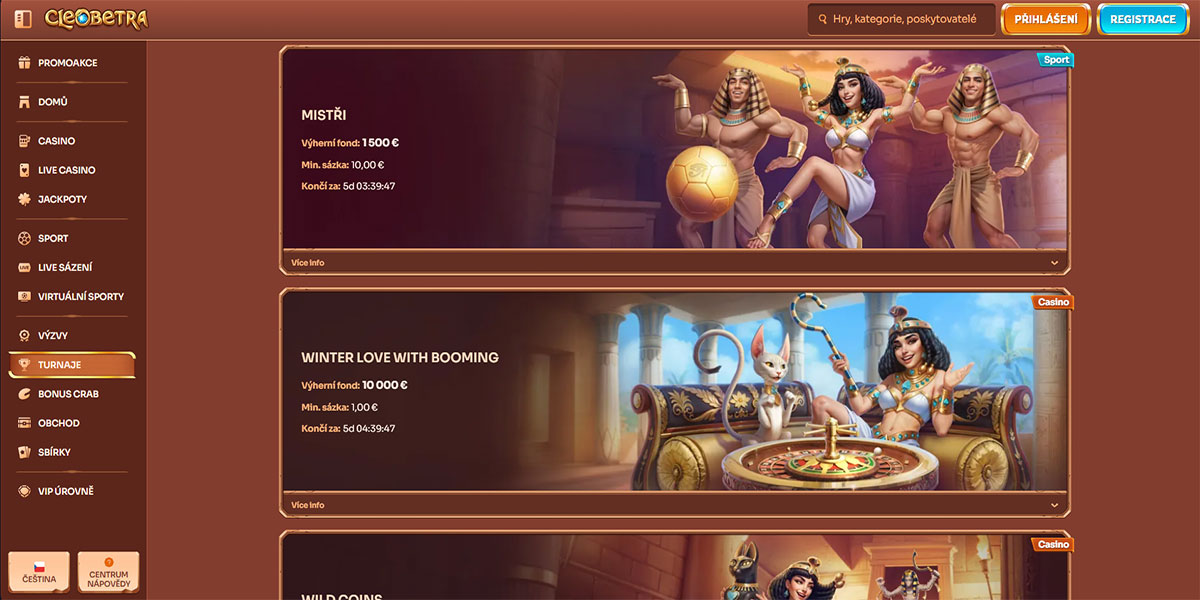 Casino Cleobetra kombinuje luxus, vzrušení a širokou škálu herních možností do jedné platformy. Provozováno pod záštitou Casinova, nabízí plnohodnotnou kasinovou sekci, prostředí s živými dealery a integrovanou sportovní knihu. Platforma je navržena pro plynulou navigaci a rychlý výkon, což zajišťuje spolehlivý zážitek pro hráče z Česka.