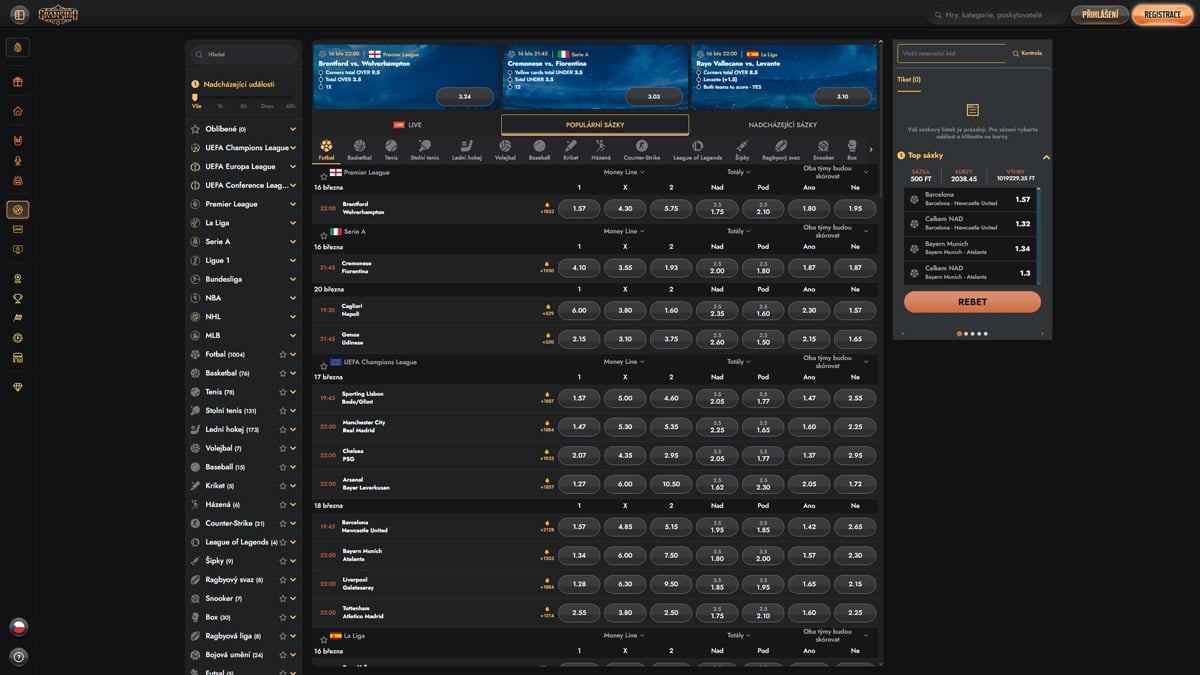 Sportovní kniha Sportovní kniha Označuje kasina, která zahrnují integrovanou sekci sportovního sázení s aktuálními kurzy a trhy napříč sportovními a esportovými událostmi.