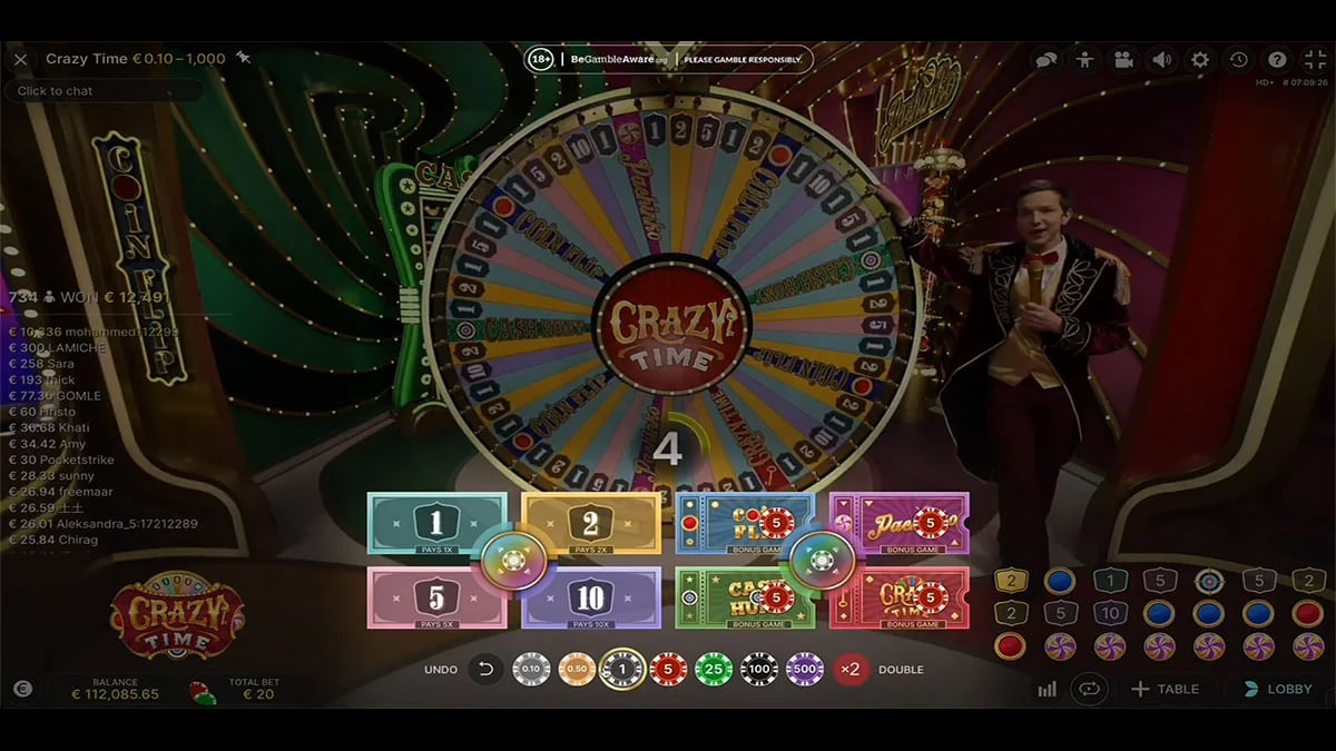 Crazy Time je živá herní show vyvinutá společností Evolution, která se točí kolem velkého, barevného kola rozděleného do 54 segmentů. Každé kolo začíná tím, že živý moderátor roztočí kolo, a hráči umístí své sázky před samotným roztočením. Možnosti sázek zahrnují čtyři standardní čísla – 1, 2, 5 a 10 – a také čtyři bonusové hry: Cash Hunt, Coin Flip, Pachinko a bonus Crazy Time. Pokud kolo dopadne na některý z číselných segmentů, hráči, kteří vsadili na toto číslo, obdrží výplatu na základě pevných kurzů, přičemž vyšší čísla se objevují méně často, ale nabízejí větší odměny. Pokud je zasažen bonusový segment, hráči, kteří vsadili na tuto funkci, vstoupí do příslušného bonusového kola, zatímco ostatní sledují, co se děje. Hra je živě vysílána z Lotyšska a je dostupná na počítačích, mobilech a tabletech s operačními systémy Android, Windows a Apple. S návratností k hráči 96,08 %, rozsahem sázek od 0,10 € do 10 000 Kč a maximálním potenciálem výhry až 20 000násobek sázky hra kombinuje dostupnost s možností značných výplat. Začlenění Top Slotu, který náhodně aplikuje násobitele na vybrané možnosti sázek nebo bonusové hry, dále vylepšuje základní mechaniku a přidává celkovému zážitku další úroveň vzrušení.