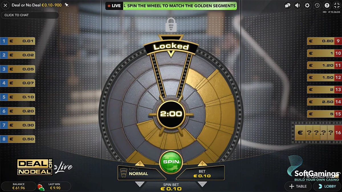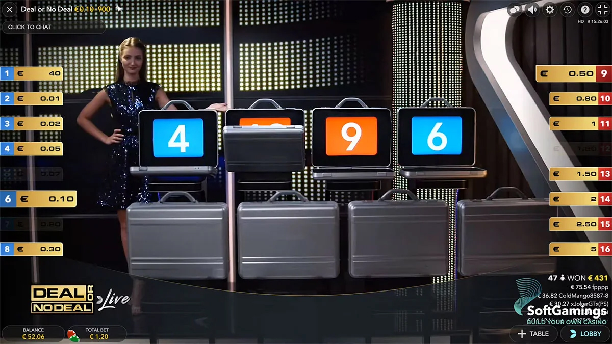 Rozhraní také podporuje užitečné funkce, jako je automatické umisťování sázek, opakování sázek pro následující kola a jasný přehled zbývajících hodnot kufříků, bankéřových nabídek a výher hráčů. Úspěch v Deal or No Deal Live závisí na kombinaci štěstí – jelikož obsah kufříků je náhodně přidělen – a strategie při reagování na bankéřovy nabídky. Na rozdíl od tradičních automatů neexistují žádné výherní linie, válce ani scatter symboly; místo toho se hratelnost soustředí výhradně na napětí, řízení pravděpodobnosti a dramatické odhalování cen v reálném čase, což vytváří vysoko energetický, interaktivní zážitek, který vystihuje podstatu původní televizní show.