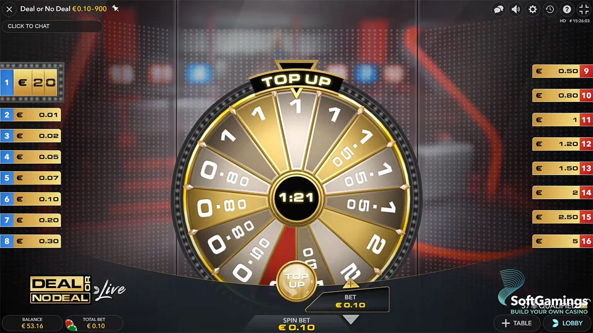 Hlavní přitažlivost hry Deal or No Deal Live od společnosti Evolution spočívá v jejích integrovaných bonusových mechanikách, které jsou přímo spojeny s hlavní hrou, spíše než v tradičních prvcích typických pro automaty. Na rozdíl od her založených na válcích se bonusy aktivují prostřednictvím bankéřových nabídek a top-up násobičů, což přidává vrstvy strategie a napětí do každého kola. Jak hráči otevírají kufříky, hra může spustit top-up kolo, kde jsou vybrané kufříky vylepšeny násobiči, což zvyšuje jejich hodnotu ceny a dává účastníkům šanci vyhrát podstatně víc, než byla jejich původní sázka. Tyto násobiče vnášejí do hry nepředvídatelnost a vysokou volatilitu, protože i malé sázky mohou vést ke značným výplatám, pokud je top-up aplikován na vysoce hodnotný kufřík.