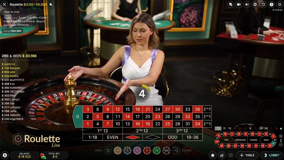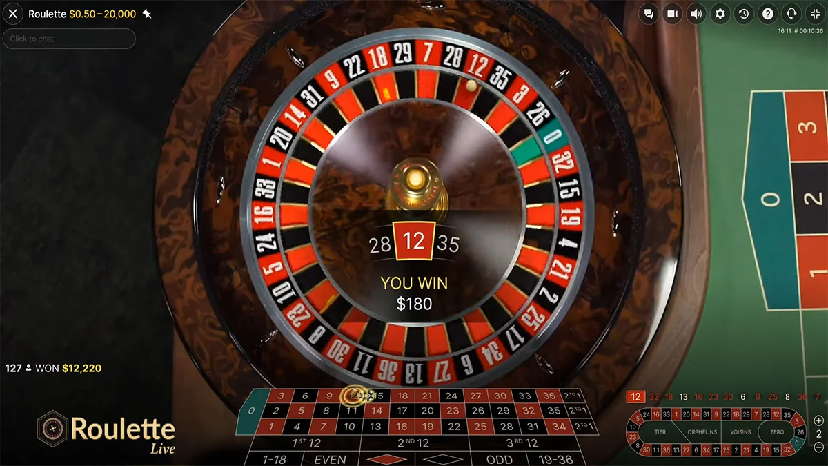 Když časovač sázení dosáhne nuly, další sázky již nejsou akceptovány a krupiér roztočí kolo jedním směrem, zatímco kuličku vrhne opačným směrem. Kulička nakonec dopadne do jedné z očíslovaných přihrádek, čímž určí výsledek kola. Systém okamžitě zaregistruje výherní číslo a automaticky vypočítá výhry na základě typu podaných sázek. Přímé sázky na číslo vyplácejí v poměru 35:1, zatímco vnější sázky jako červená/černá nebo sudá/lichá vyplácejí 1:1, což odpovídá klasické evropské ruletové výplatní struktuře. Formát s jednou nulou zaručuje výhodu kasína (house edge) ve výši 2,70 %, která je do hry matematicky zabudována.