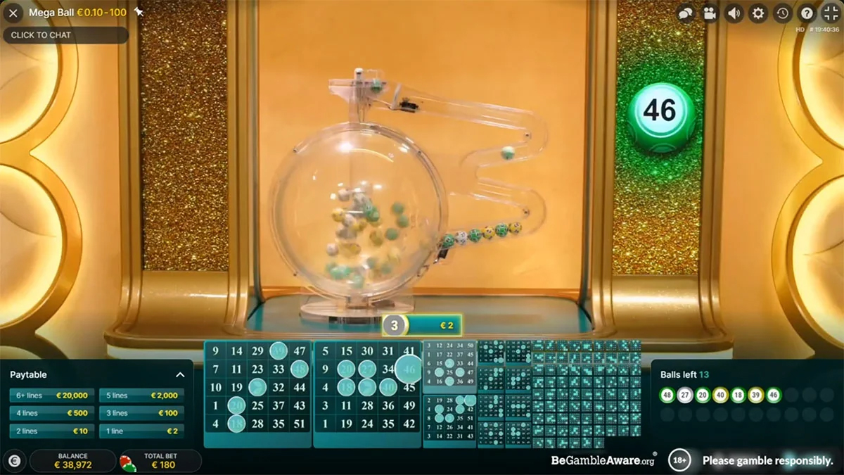 Herní rozhraní zobrazuje každou kartu přehledně, ukazuje označená čísla, dokončené linie, zbývající kuličky a nahromaděné výhry. Hráči mohou sledovat výsledky v reálném čase a zároveň komunikovat se živým krupiérem, který oznamuje losování a zvyšuje očekávání. Na rozdíl od tradičních výherních automatů neexistují žádné válce, scatter symboly ani volné otáčky; hratelnost se točí výlučně kolem přiřazování čísel, dokončování linií a efektů násobičů. Úspěch v Mega Ball je proto poháněn štěstím a strategickým výběrem počtu karet a velikosti sázky, přičemž Mega Ball násobič poskytuje nejvyšší potenciál odměny v každém kole.