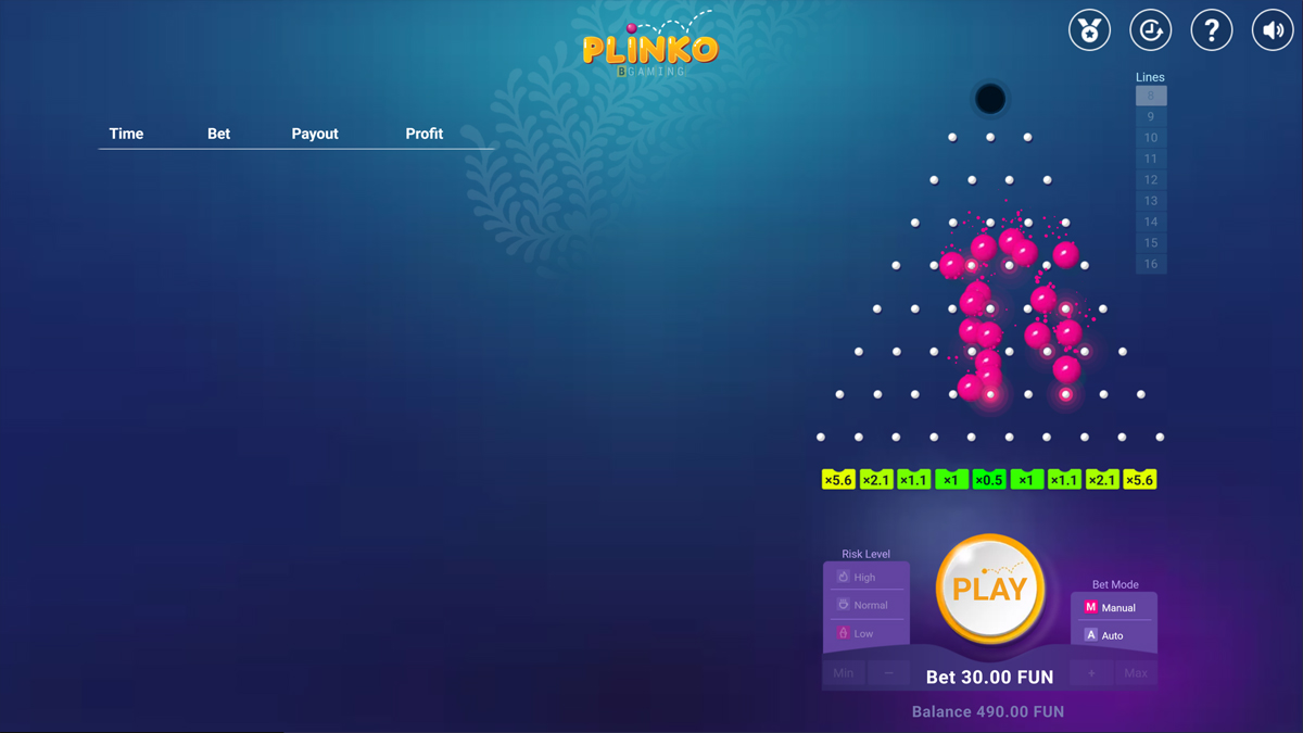 Plinko nabízí jednoduchou a intuitivní hratelnost, při které hráči jednoduše stisknou tlačítko „hrát“, aby pustili kuličky z vrchu pyramidy. Kuličky se náhodně odrážejí do buněk s různými hodnotami, které rostou od středu směrem k okrajům, a odpovídající částka se automaticky připočítává k zůstatku hráče.