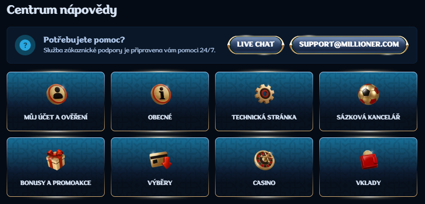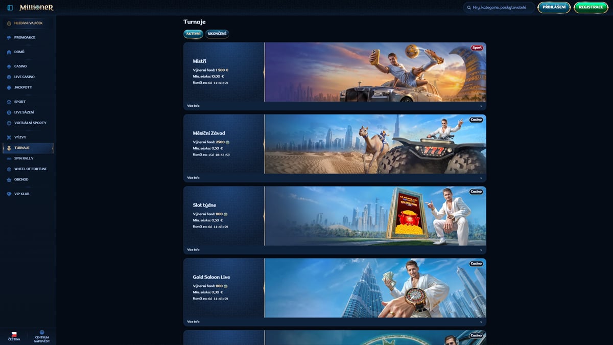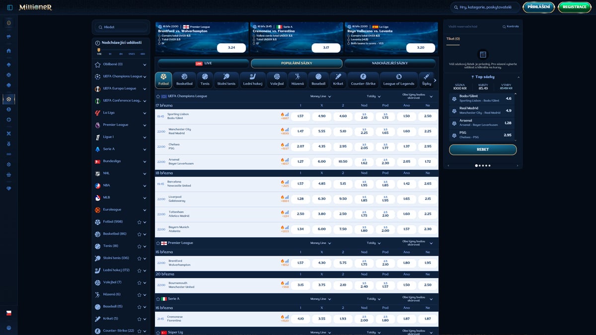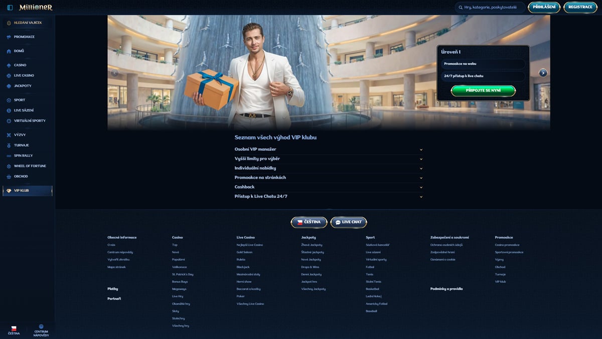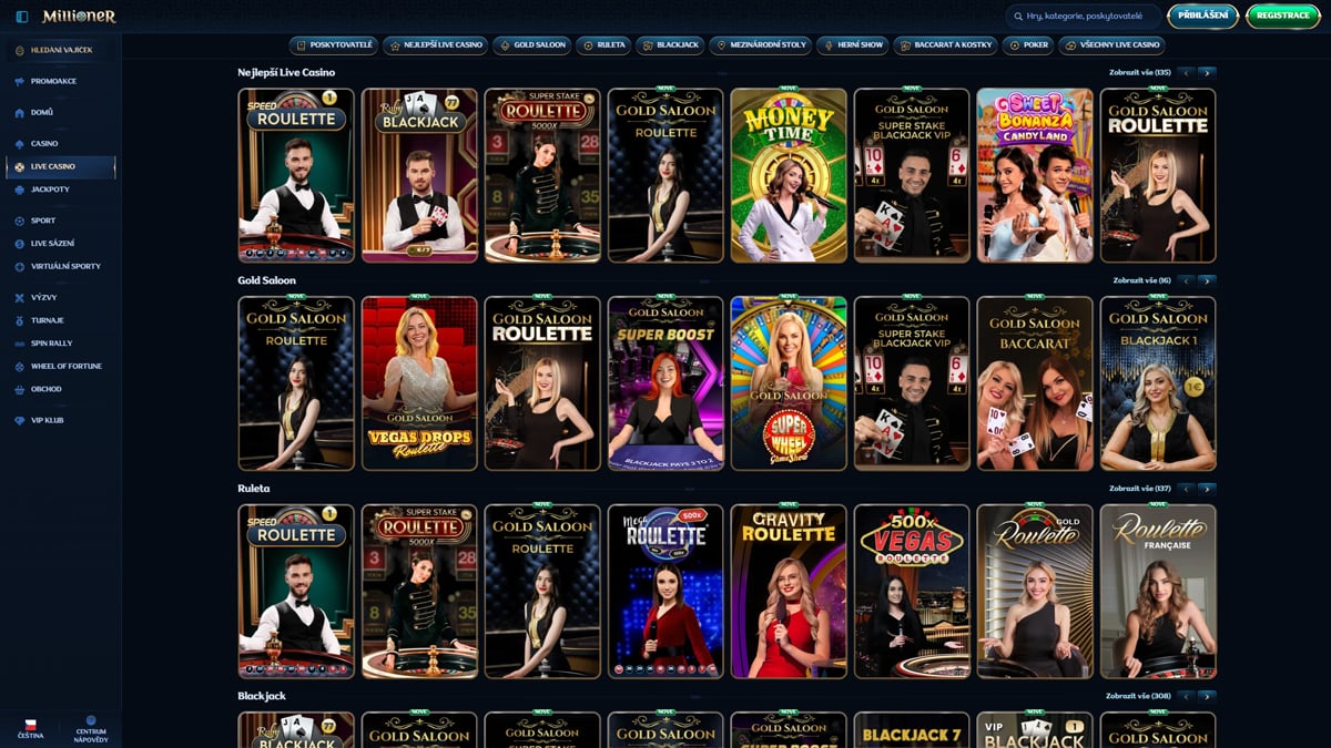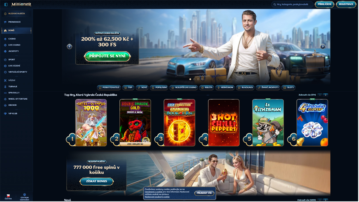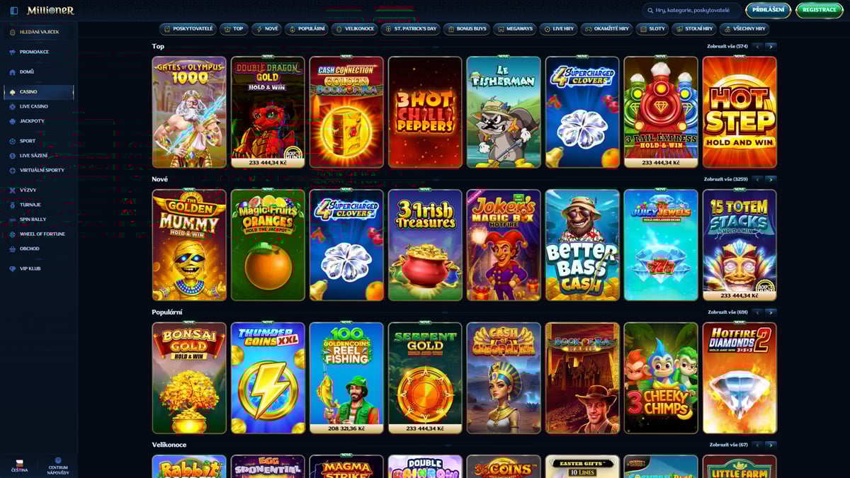 Millioner Casino je zcela nová platforma (založená v roce 2025), která přichází s moderním designem a překvapivě kompletní nabídkou produktů hned od začátku. Design působí svěže a rychle a navigace zůstává přehledná, i když casino zahrnuje téměř vše: kompletní sportovní knihu, automaty, live casino, jackpoty, závody, mise, systém obchodu a strukturovaný VIP program. Nejsilnějším prvním dojmem je hloubka. Nedíváte se na malé startovací casino. S více než 12 200 automaty a 700+ live hrami se Millioner jednoznačně zaměřuje na velký objem obsahu, podpořený silnou sítí poskytovatelů jako Evolution, Pragmatic Play, Play’n GO, NetEnt, Nolimit City, Hacksaw a mnoha dalšími. Platební metody jsou pro Českou republiku dobře pokryty, se standardními kartami, bankovními převody, Paysafecard, Revolut a několika kryptoměnami, plus nízkým startovacím limitem 10 € pro vklady i výběry.