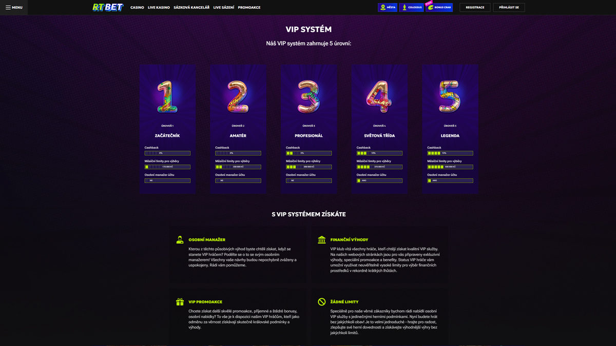 VIP program VIP program Víceúrovňový VIP věrnostní program pro časté nebo vysoce aktivní hráče, nabízející individuální odměny, jako jsou exkluzivní bonusy, rychlejší výběry a osobní manažeři účtů.