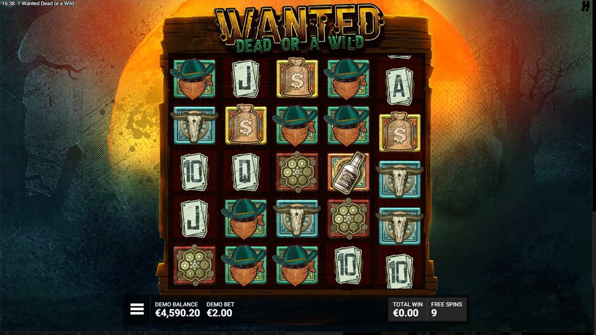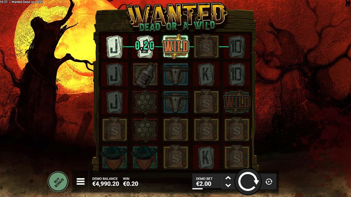 Hra využívá tradiční uspořádání 5×5 s 15 výherními liniemi, kde výhry tvoří shodné symboly zleva doprava. Na rozdíl od mnoha moderních automatů, které spoléhají na neustálou zpětnou vazbu v základní hře, má Wanted Dead or a Wild záměrně tlumenou základní hru. Výhry se objevují méně často, což odráží jeho frekvenci zásahů 19,36, ale tento konstrukční záměr zvyšuje dopad aktivace funkcí.
